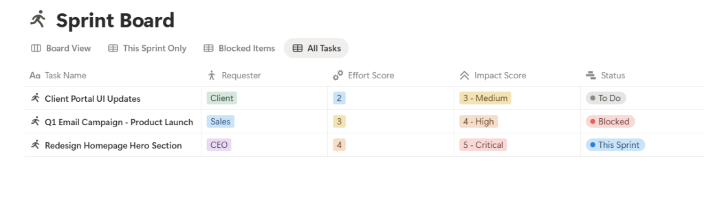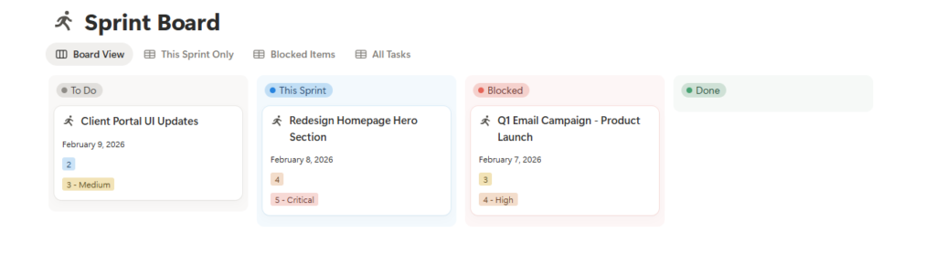 The Purpose: To make invisible delays visible. A task sitting in “Sprint” that isn’t moving looks like procrastination. A task sitting in “Blocked” signals a dependency issue.
